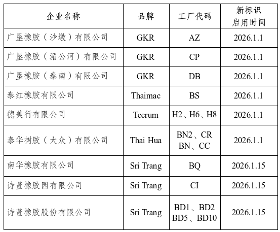 三、南华橡胶有限公司等3家企业涉及6家工厂2026年1月15日(含)以后生产的20号胶新标识包装的产品,可入库生成标准仓单,1月15日以前生产的20号胶旧标识包装的产品仍然可以生成标准仓单用于交割。