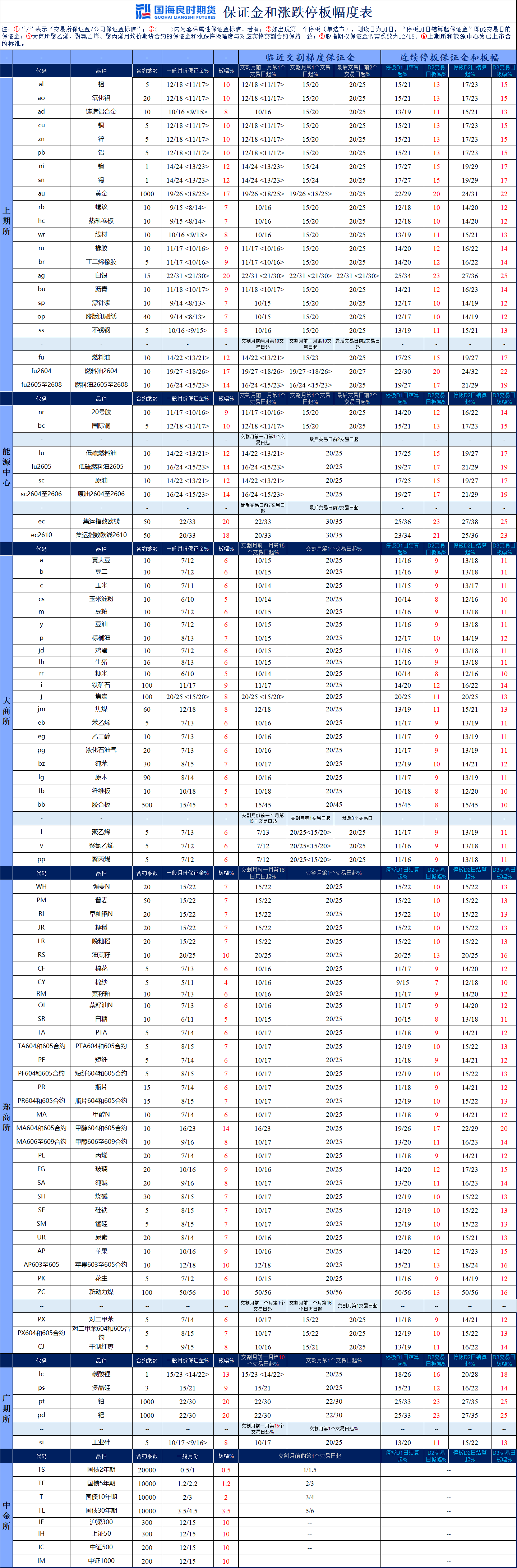 国海良时期货——公司保证金标准及停板幅度表20260304