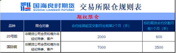 20号胶期权合约月份涉及的标的期货持仓量阈值为10000手(单边);国际铜期权合约月份涉及的标的期货持仓量阈值为5000手(单边)。