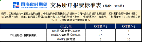 20号胶、国际铜期权对客户信息量收取申报费,各品种收取标准一致,如下表所示: