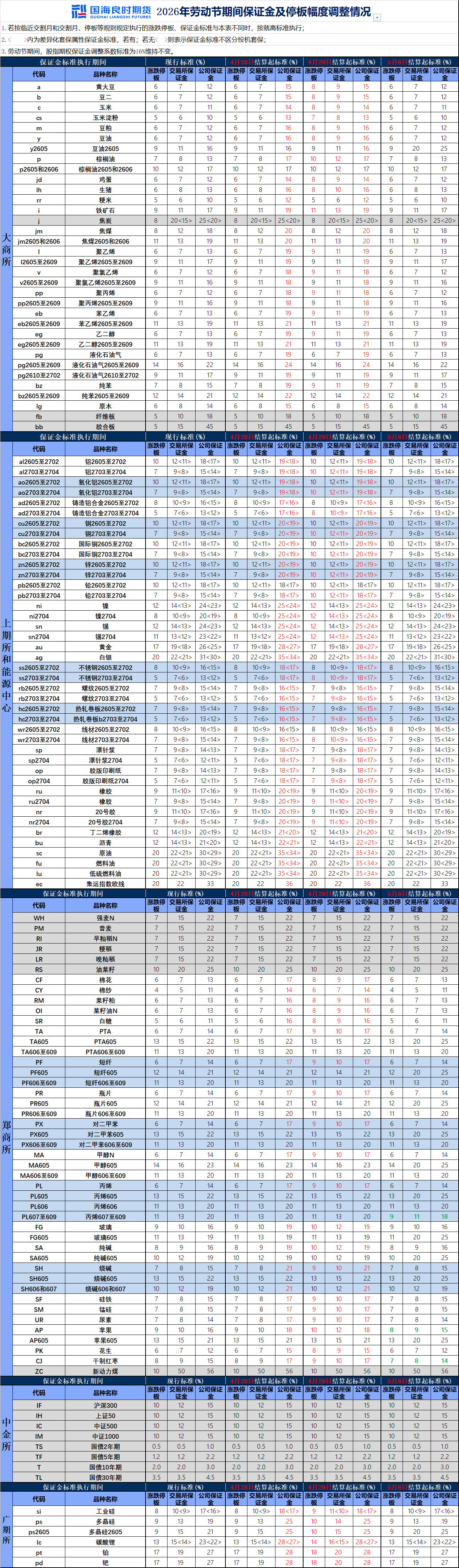根据大连商品交易所《关于2026年劳动节假期调整相关品种期货合约涨跌停板幅度和交易保证金水平的通知》(大商所发〔2026〕154号)、郑州商品交易所《关于2026年劳动节期间调整部分期货合约交易保证金标准和涨跌停板幅度的通知》(郑商函〔2026〕402号)、上海期货交易所《关于2026年劳动节期间有关工作安排的通知》(上期发〔2026〕165号)、上海国际能源交易中心《关于2026年劳动节期间有关工作安排的通知》(上能发〔2026〕55号)、广州期货交易所《关于2026年劳动节假期调整相关期货合约涨跌停板幅度和交易保证金标准的通知》(广期所公告〔2026〕25号)精神以及《国海良时期货有限公司期货经纪业务交易风险管理办法》的有关规定,公司经研究决定,对2026年劳动节期间期货品种合约交易保证金标准作如下调整: