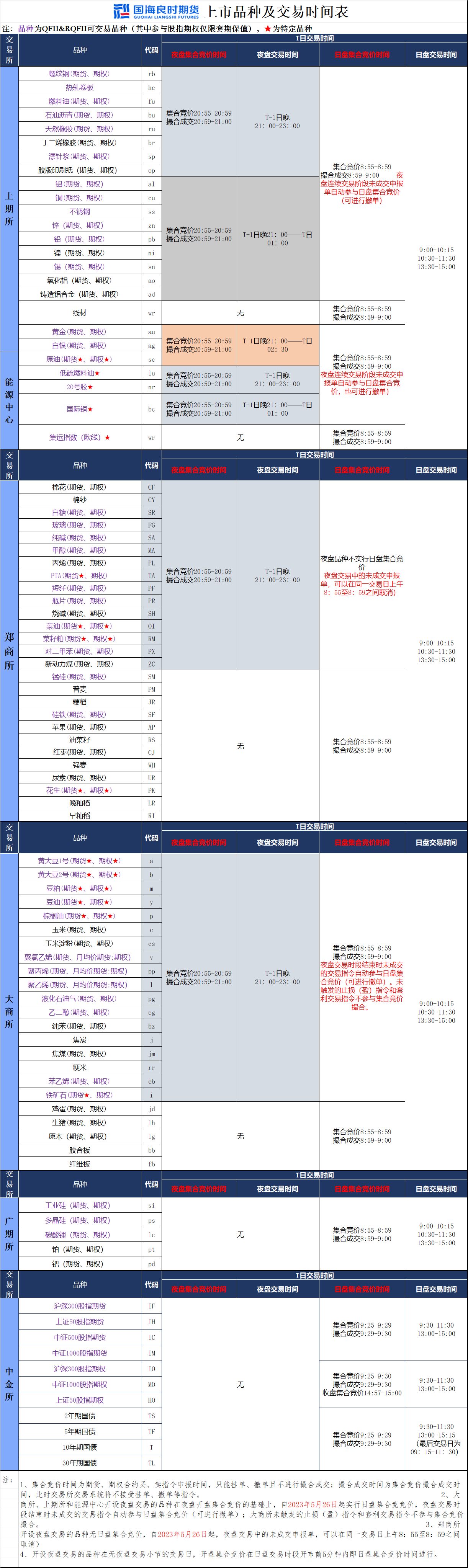 国海良时期货——上市品种交易时间表