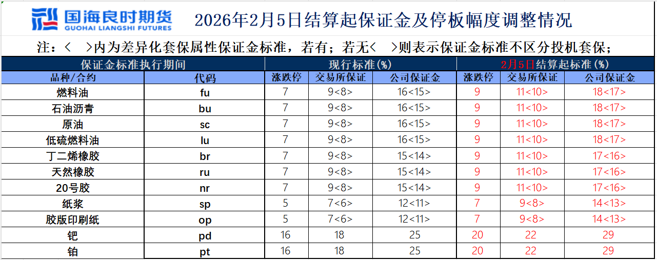 自2026年2月5日结算时起,铂、钯期货合约的投机交易保证金标准调整为29%;燃料油、石油沥青、原油、低硫燃料油期货合约的投机交易保证金标准调整为18%,套期保值交易保证金标准调整为17%;丁二烯橡胶、天然橡胶、20号胶期货合约的投机交易保证金标准调整为17%,套期保值交易保证金标准调整为16%;纸浆、胶版印刷纸期货合约的投机交易保证金标准调整为14%,套期保值交易保证金标准调整为13%。