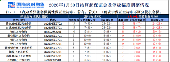 自2026年1月30日结算时起,黄金期货AU2606、AU2608、AU2610、AU2612、AU2702合约、白银期货AG2605至AG2701合约的投机交易保证金标准调整为24%,套期保值交易保证金标准调整为23%;镍期货已上市合约的投机交易保证金标准调整为20%,套期保值交易保证金标准调整为19%;氧化铝、铅、锌期货已上市合约的投机交易保证金标准调整为17%,套期保值交易保证金标准调整为16%;铸造铝合金、螺纹钢、热轧卷板、不锈钢期货已上市合约的投机交易保证金标准调整为15%,套期保值交易保证金标准调整为14%。